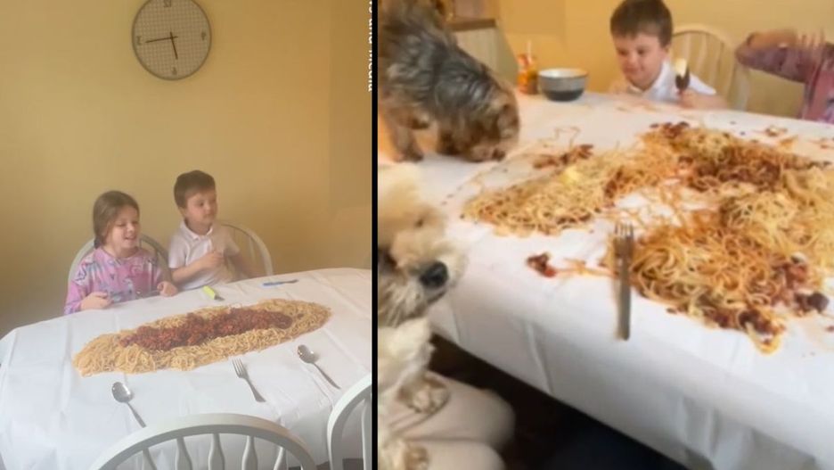 - Co robisz? - pyta dziewczynka. Kobieta z uśmiechem tłumaczy, że "dzisiaj będzie zabawny obiad". Dzieciaki szybko zabrały się za pałaszowanie dania. Do uczty dołączyły się nawet dwa psy.