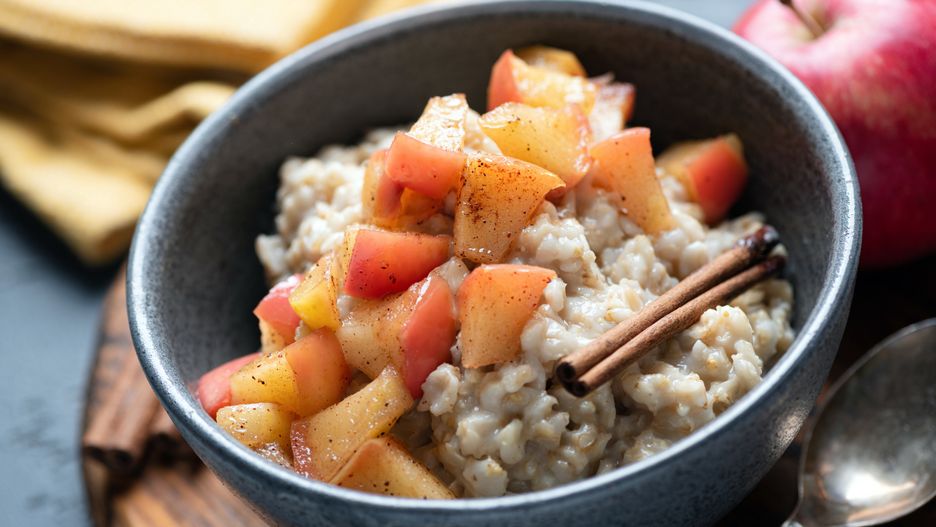 - Płatki owsiane i starte jabłko zalej mlekiem, dodaj cynamon i gotuj, mieszając, aż owsianka wchłonie cały płyn.