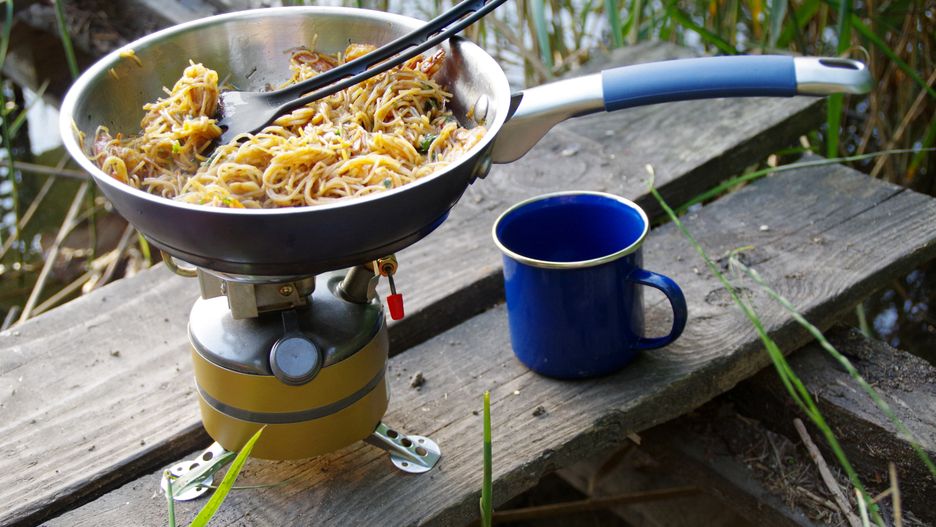 - garnek lub patelnia z odpinaną rączką – pozwala zaoszczędzić miejsce w plecaku, a do tego sprawdzi się zarówno na kuchence gazowej, jak i na ognisku;