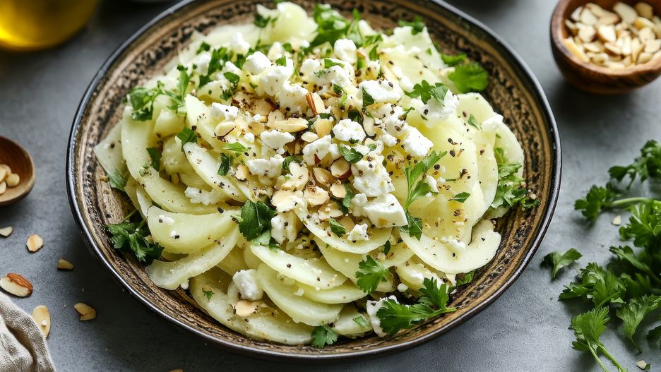 Kalarepa to warzywo pochodzące z rodziny roślin kapustowatych. Jest bogata w witaminy, minerały, błonnik i antocyjany, czyli związki o działaniu przeciwutleniającym, przeciwzapalnym i antynowotworowym. Niskokaloryczna kalarepa dostarcza jedynie 27 kcal w 100 gramach i ma niski indeks glikemiczny (IG = 20), dzięki czemu jest idealna dla osób dbających o linię. Kalarepę wystarczy obrać ze skórki i można jeść w surowej postaci. Doskonale nadaje się też do przygotowania sałatki. Nasza propozycja to sałatka z dodatkiem fety, posiekanych migdałów i natki pietruszki, a wszystko to skropione oliwą z oliwek i sokiem z cytryny. To połączenie tworzy zachwycającą sałatkę, idealną do posiłku lub jako samodzielna przekąska.