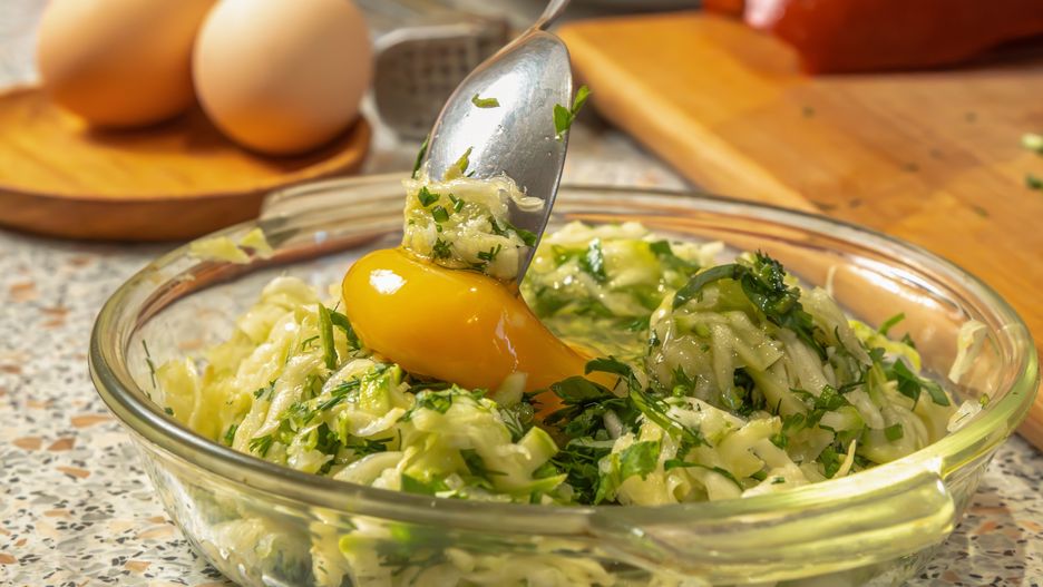 - Do miski ze startą cukinią dodaj dwa umyte jajka. Obrany ząbek czosnku przepuść przez praskę, posiekaj również cienki szczypiorek. Dodaj składniki do miski.