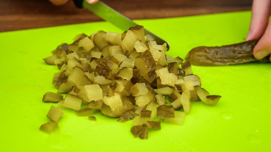 Krok 1. Ogórki odcedź z zalewy i pokrój w kostkę. Cebulę obierz i pokrój w kostkę. Jabłko umyj, obierz i zetrzyj na tarce o średnich oczkach. Natkę pietruszki umyj, osusz i drobno posiekaj.