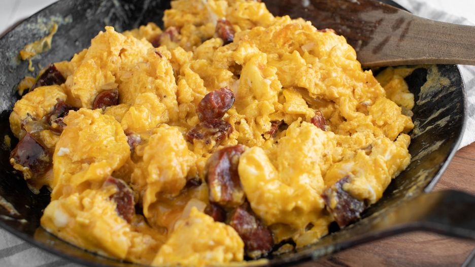 - Przełóż na talerz, gdy jajecznica osiągnie pożądany stopień wysmażenia.