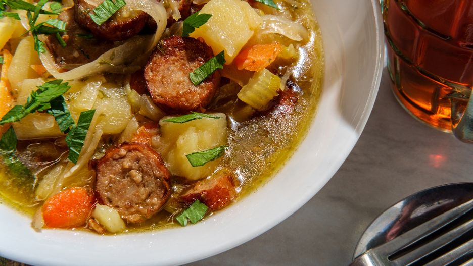 - Podsmaż posiekaną cebulę, dodaj pokrojony seler i ziemniaki.