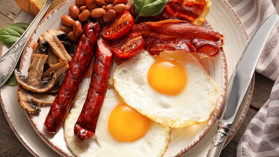 Na talerzu znajdziemy zazwyczaj jajka (najczęściej sadzone lub w formie jajecznicy), smażony boczek, kiełbaski, fasolkę w sosie pomidorowym, pieczarki, pomidory, pieczywo, czasem także masło lub dżem. Takie połączenie dostarcza wielu składników odżywczych: pełnowartościowe białko, błonnik, żelazo, witaminy z grupy B i zdrowe tłuszcze, ale też sporo kalorii.