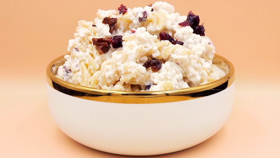 Główną rolę odgrywa tu twaróg. Jest lekki, ale pełen pełnowartościowego białka wspierającego regenerację mięśni oraz wapnia dbającego o mocne kości i zdrowe zęby. Dodatek jogurtu nadaje całości kremową konsystencję, dzięki czemu danie jest delikatne i przyjemne w smaku. Rodzynki wnoszą naturalną słodycz, a przy okazji żelazo, potas i błonnik, który wspiera trawienie i dodaje energii na kolejne godziny.