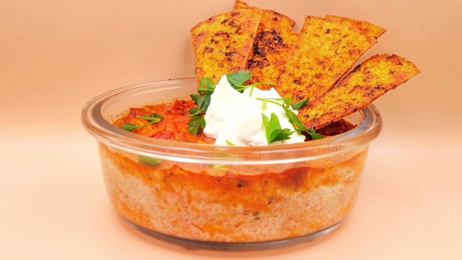 - Przygotuj nachosy: Wymieszaj oliwę z przyprawami, posmaruj tortillę, pokrój ją w trójkąty i podgrzewaj w mikrofalówce 2-3 minuty, aż zrobi się chrupiąca.