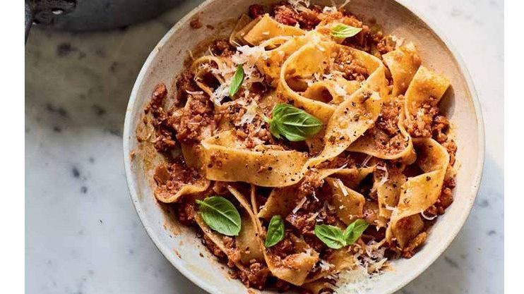 4. Ugotuj pappardelle w dużym rondlu z osoloną, wrzącą wodą według instrukcji na opakowaniu. Gdy makaron będzie gotowy, przełóż go szczypcami do rondla z sosem, wymieszaj całość. Jeśli sos jest zbyt gęsty, dodaj trochę wody pozostałej po gotowaniu makaronu. Nałóż na głębokie talerze, posyp tartym parmezanem i liśćmi bazylii.