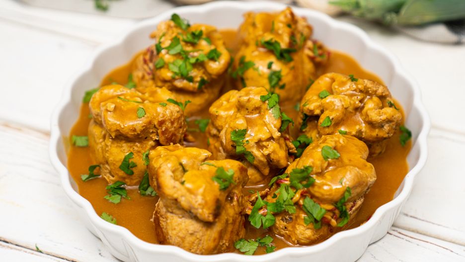 Sakiewki schabowe z farszem pieczarkowym w sosie własnym. Pomysł na obiad z wieprzowiny