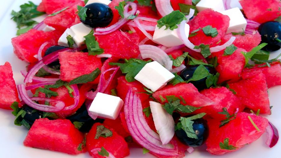 4. Do cebuli dodaj oliwę z oliwek, wymieszaj, a następnie wrzuć mieszankę do miski z arbuzem, fetą, oliwkami, pietruszką i miętą. Na koniec posyp sałatkę szczyptą pieprzu.