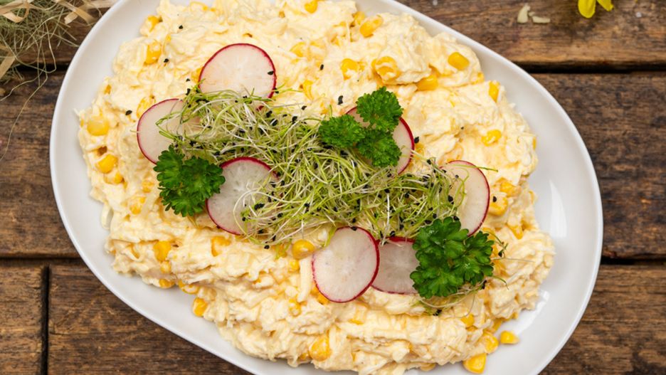 Bazą genialnej kombinacji smakowej są oczywiście jajka, kukurydza oraz majonez. Oprócz nich znajdziesz tu również ważny akcent świąteczny, bez którego nie sposób wyobrazić sobie Wielkanocy. Oczywiście chodzi tu o chrzan, który nada mieszance wyjątkowej wyrazistości. Co więcej, ciekawym i dość nietypowym dodatkiem będzie ananas, który jak się okazuje, świetnie czuje się w towarzystwie wyżej wymienionych produktów. To będzie naprawdę coś wyjątkowego, dlatego też nie zwlekaj i jak najszybciej zapoznaj się z całą recepturą. Gwarantuję, że z pewnością nie pożałujesz.