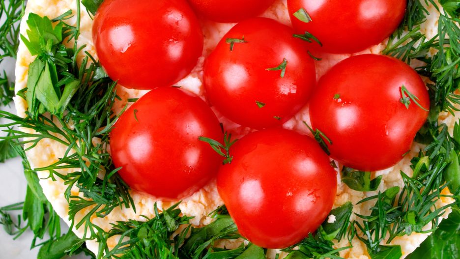 - Następnie rozkładasz rozdrobnione żółtka i pomidorki koktajlowe. Wokół nich rozsypujesz natkę pietruszki, rukolę lub sałatę.