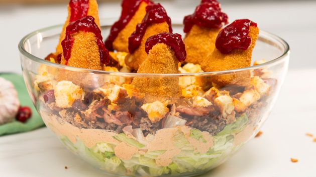 Warstwowa sałatka Drwala 2.0 stanie się hitem w każdym domu. Skąd to wiemy? Kiedy pojawia się na stole, znika w mgnieniu oka. Znajdziesz tu same rarytasy: smażoną wołowinę i boczek, camembert w chrupiącej panierce, dwa rodzaje sosu, prażoną cebulkę oraz grzanki z serowym dodatkiem. Dlatego nie zwlekaj i na imprezę andrzejkową zaplanuj właśnie naszą sałatkę. Lista składników czeka poniżej, a dokładną instrukcję znajdziesz w wideo.
