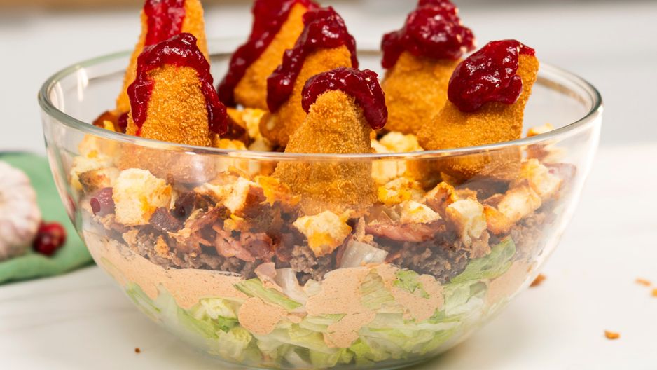 - Jak złożyć sałatkę? Na spodzie dużej miski ułóż podzieloną na mniejsze kawałki sałatę lodową. Kolejną warstwę zrób z domowego sosu z dodatkiem korniszonów. Następnie dodaj usmażoną wołowinę, chrupiący boczek, prażoną cebulę, grzanki i kawałki sera w panierce z patyczkami. Dzięki drewnianym elementom bez problemu będziesz mógł je wbić w zrobione przed chwilą warstwy. Na każdym kawałku camemberta rozprowadź sos żurawinowy.