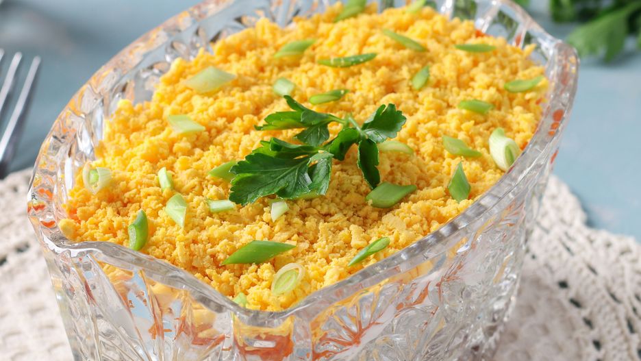 Warstwowa sałatka z kurczakiem, jajkiem i serem żółtym. Przepis na sałatkę milionera