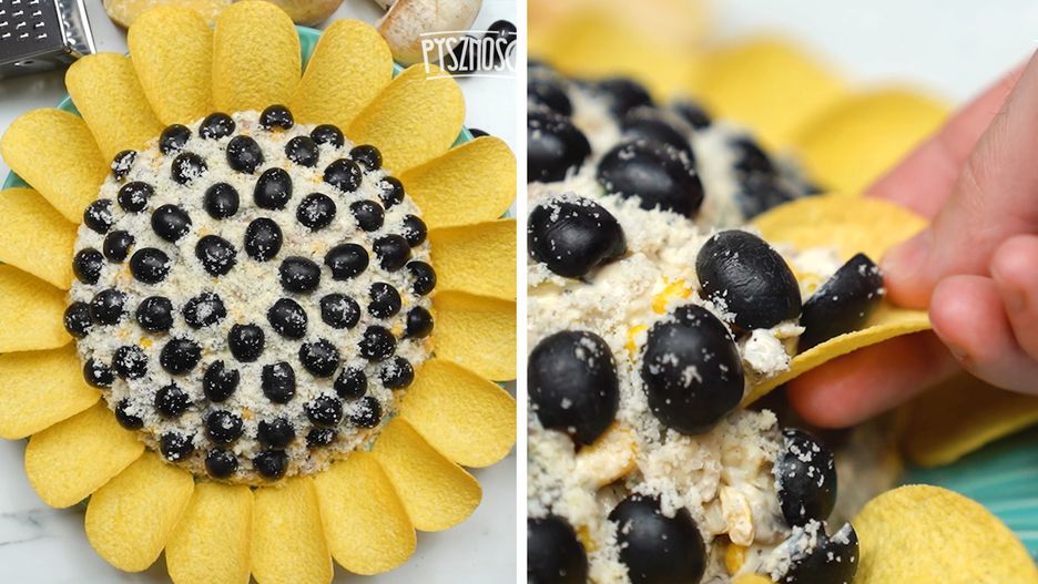 Po rym czasie wyciągnij sałatkę z lodówki. Przykryj ją talerzem i odwróć, żeby powstała na nim sałatkowa kopułka. Na filmiku pokazujemy Ci, jak to zrobić. Sałatkę udekoruj oliwkami, które mają imitować pestki słonecznika. Posyp całość startym parmezanem, a na brzegu talerza ułóż chipsy. Najlepiej sprawdzą się tutaj niezbyt mocno przyprawione, np. solone.