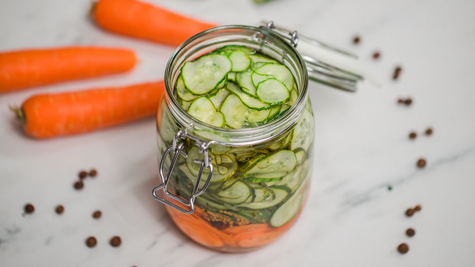 1. Cały proces rozpocznij od podzielenia ogórków w cienkie talarki. Następnie zalej je wodą z rozpuszczoną solą i odstaw na 2 godziny.