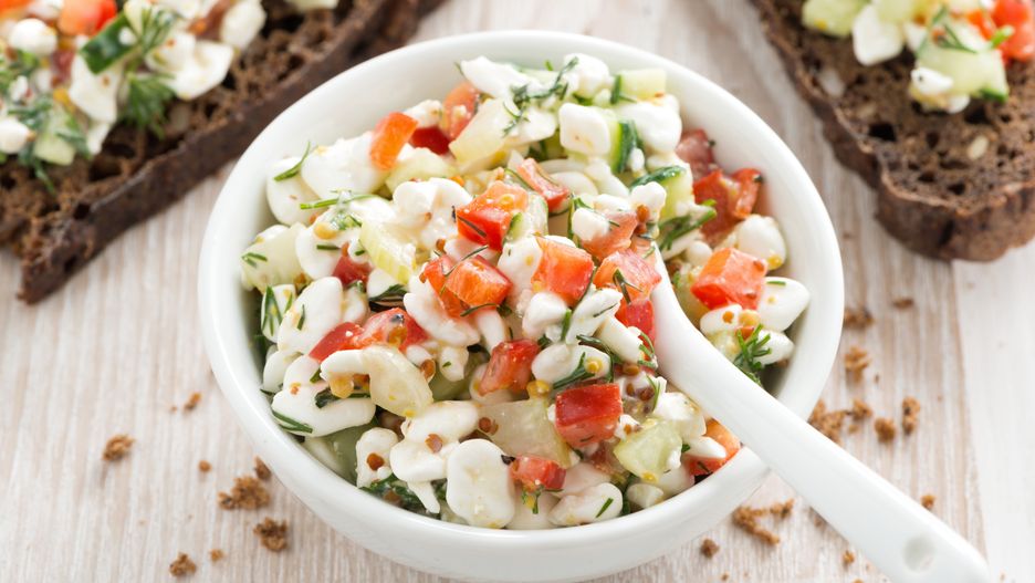 Twaróg nazywany białym serem to jeden z najlepszych wyborów śniadaniowych według dietetyków. To świetne źródło białka, ale to dopiero początek jego zalet. Do sałatki z warzywami najłatwiej użyć go w wersji serka wiejskiego. Można zawsze mieć go w lodówce - jedno opakowanie to wystarczająca porcja na sałatkę. Nic też nie stoi na przeszkodzie, by użyć klasycznego twarogu wymieszanego z jogurtem naturalnym czy śmietaną. Jednak ta opcja jest nieco bardziej czasochłonna.