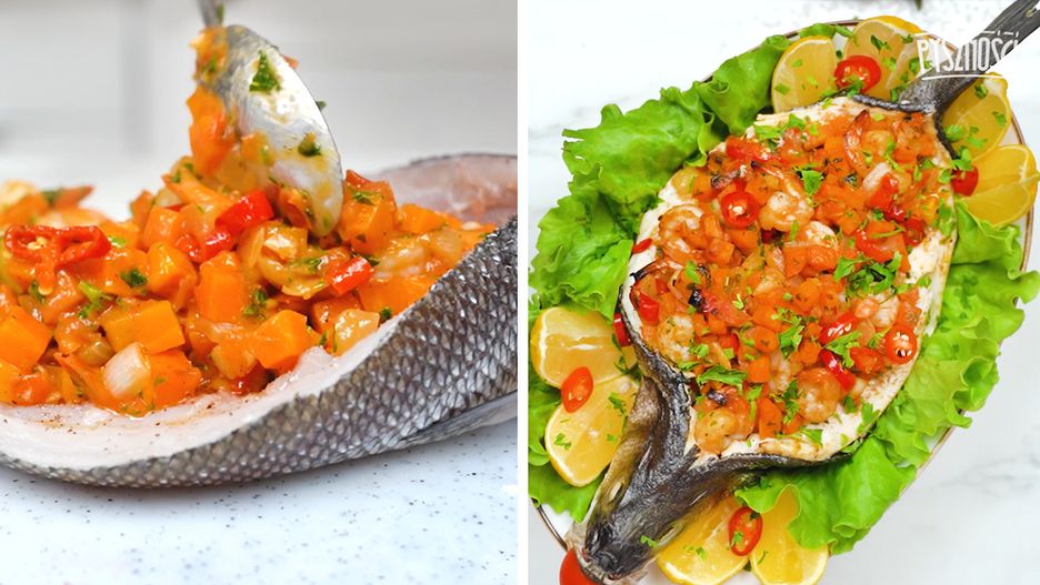 Sałatki można podawać na wiele różnych sposobów i za każdym razem odkrywać je na nowo. Kluczem do odpowiedniego ich przygotowania jest odpowiednia kompozycja składników, która współgra ze sobą i tworzy pyszną całość. W Polsce od wielu lat prym wiedzie sałatka jarzynowa i gyrosowa, ale nie brakuje też połączeń lekkich warzyw z sosami i dipami. Dziś postawiliśmy jednak na coś kompletnie innego. Pieczoną rybę nafaszerowaliśmy krewetkową, nieco śródziemnomorską sałatką. To połączenie pokochają wszyscy fani owoców morza.