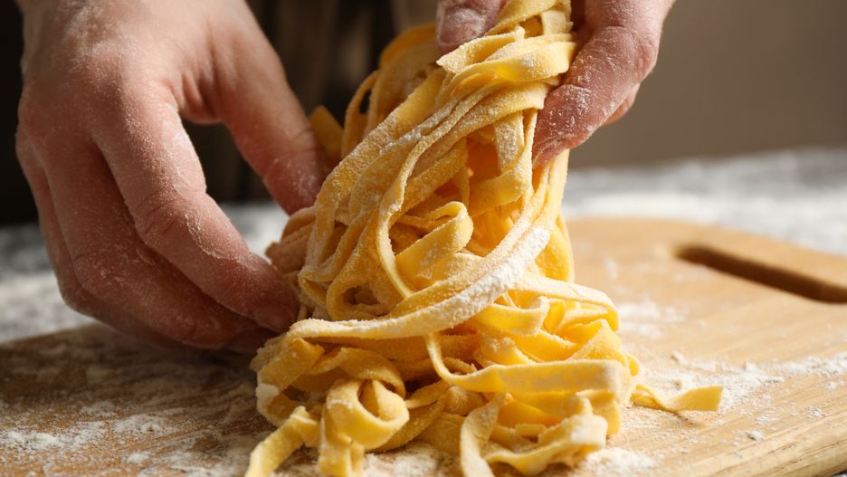 5. Rozłóż makaron na stolnicy i pozostaw na kilkanaście minut do lekkiego przeschnięcia.