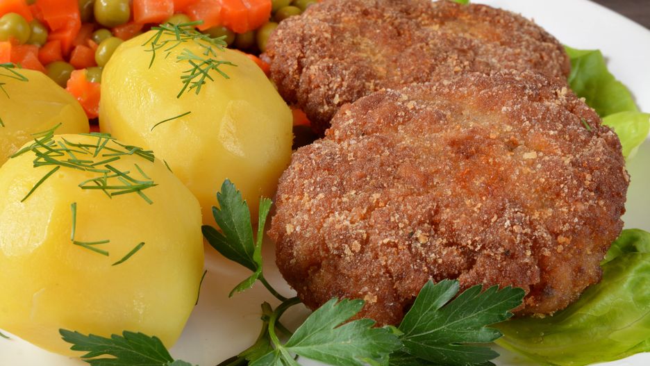 - Gotowe kotlety podawaj z ulubionymi dodatkami, np. gotowanymi ziemniakami i marchewką z groszkiem.