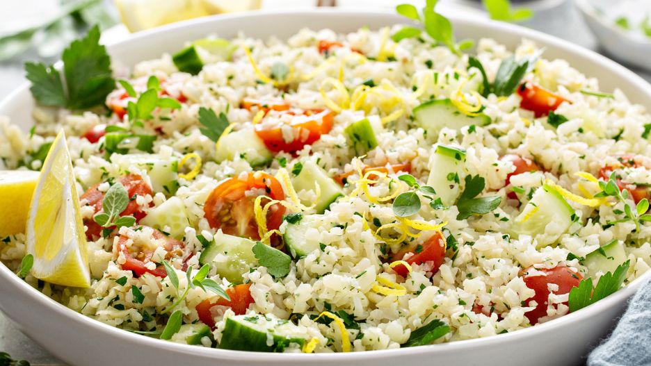- Przełóż starty kalafior, ogórka, pomidorki, natkę pietruszki, ciecierzycę i rukolę do dużej miski.