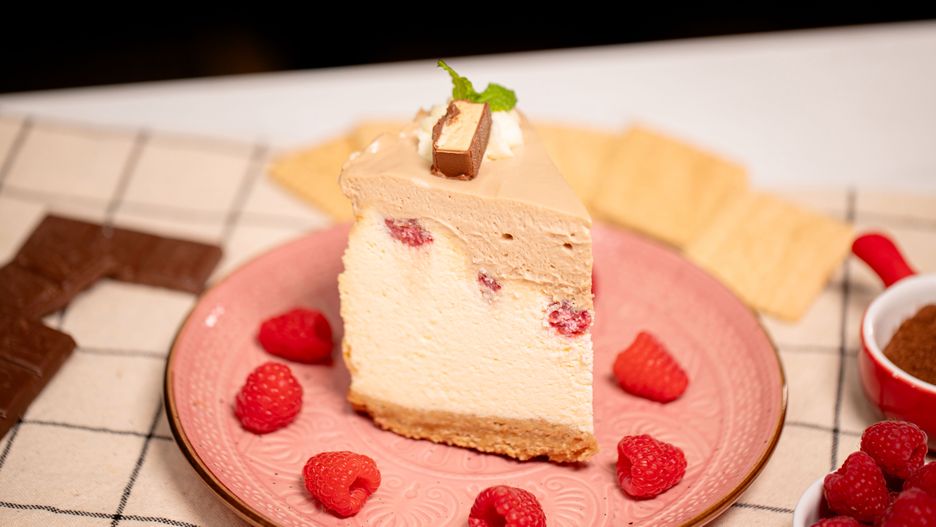 Sernik Milky Way to idealny deser dla miłośników słodkości. Kremowa masa twarogowa zwieńczona czekoladowym musem i rześkimi malinami zrobi wrażenie na wszystkich gościach.