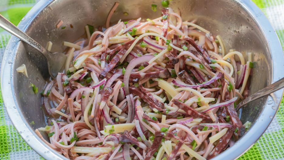 - Wędliny pokrój w cienkie paseczki i przełóż do dużej miski.
