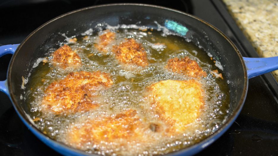 - Kiedy już dokładnie obtoczysz filety rybne w cieście naleśnikowym, umieść je na dobrze nagrzanej i natłuszczonej patelni.