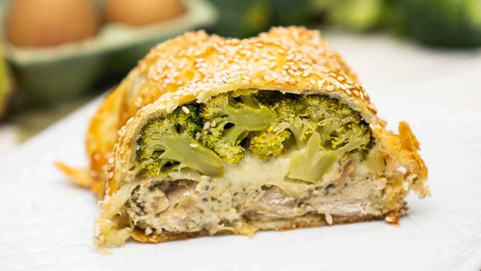 Śmietankowy kurczak w cieście francuskim z brokułami
