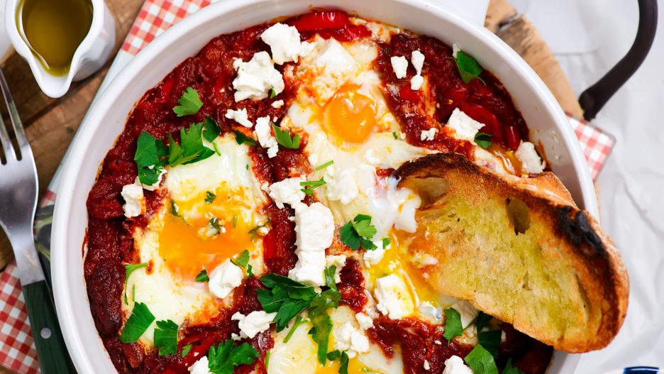 Szakszukę najlepiej podawać prosto z patelni w towarzystwie chrupiącej bagietki lub ciepłego chlebka pita. Świeże pieczywo jest niezbędne, by móc do końca wyjeść pyszny sos i płynne żółtka.