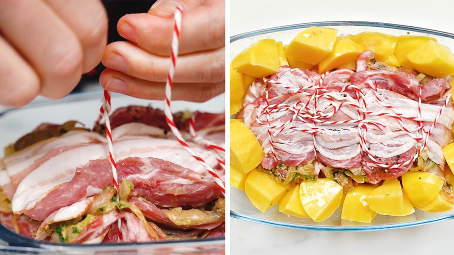 Na żaroodpornym naczyniu ułóż sznurek do wędlin. Następnie włóż rozbitą karkówkę. Dopraw solą oraz pieprzem i wyłóż pieczarkowy farsz.