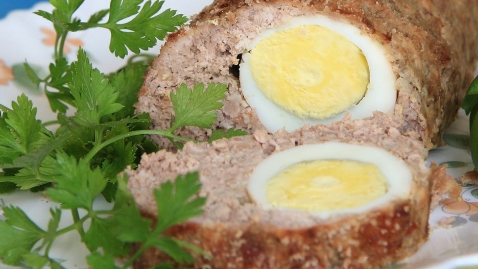 - Mięsną masę rozkładam na folii spożywczej, formując prostokąt. Wzdłuż środka układam jajka i przy pomocy folii zawijam mięso w zwartą roladę.