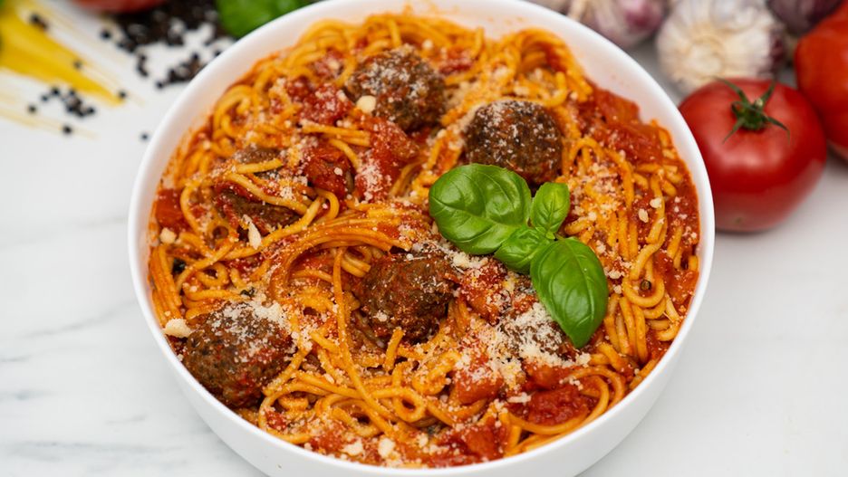 Aromatyczne spaghetti z sosem pomidorowym i mięsnym klopsikami to obiadowy klasyk. Kultowe włoskie danie przygotujesz w jednym urządzeniu.