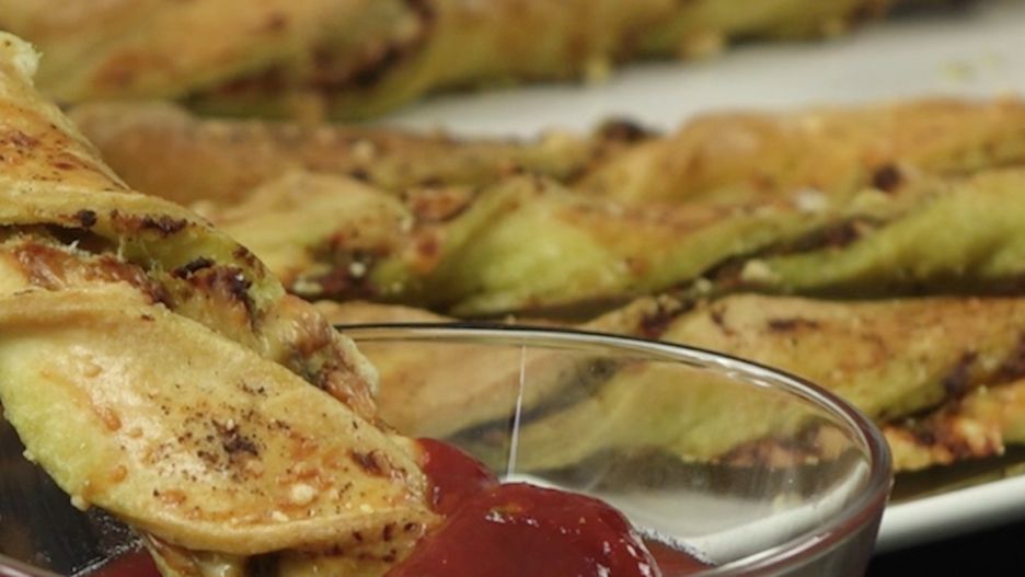 Spirale z ciasta francuskiego z pesto, mozzarellą i parmezanem