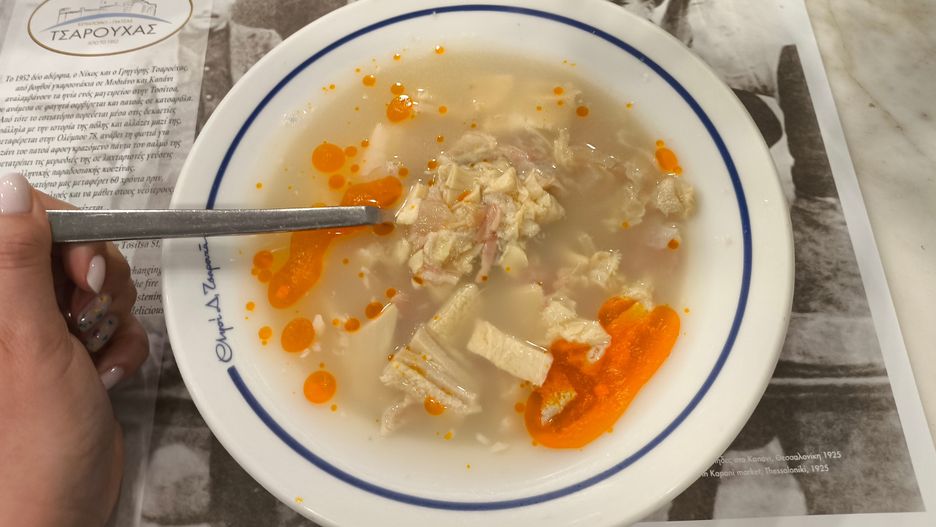 Tłumaczę mu, że podroby w Polsce nie są niczym zaskakującym, a flaczki gotowała często moja babcia, chociaż smakowały zupełnie inaczej. Te greckie są kwaśne, z lekką nutą ostrości. Bulion jest delikatny, a flaki i mięso z golonki delikatne i mięciutkie. Nie ma tutaj majeranku, ziela angielskiego czy przecieru pomidorowego, czyli składników znanych z polskiej zupy. Jest zaskakująco lekko i przyjemnie, chociaż nie dla każdego patsas będą obowiązkową pozycją przy zwiedzaniu Salonik.