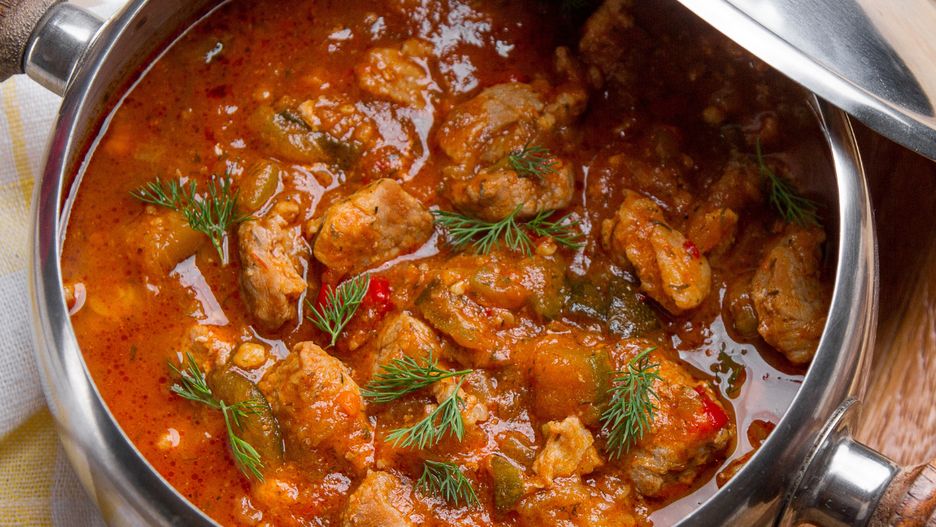 - Papryki pokrój w kostkę, a następnie podsmaż je. Kiedy zarumienią się, dorzuć je do garnka z mięsem.