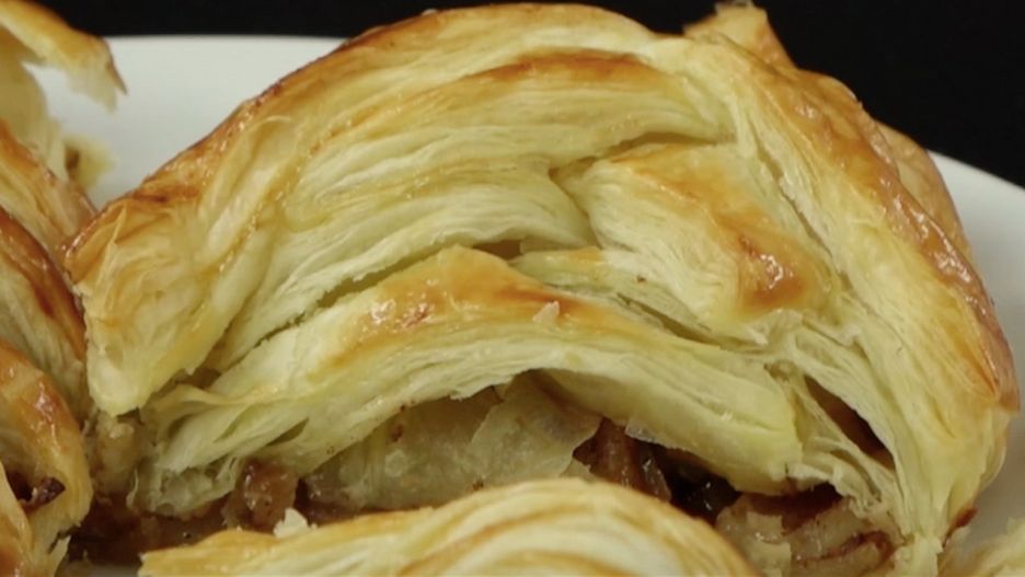 Strudel z ciasta francuskiego nadziewany jabłkami, orzechami włoskimi i cynamonem