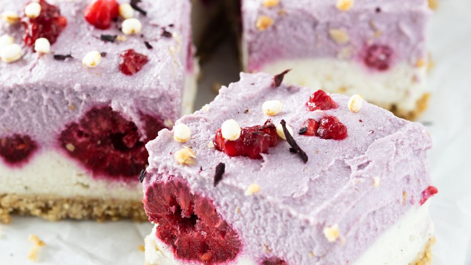 - Warstwa owocowa: Maliny zmiksuj z sokiem z cytryny i miodem na gładką masę. Delikatnie wylej na warstwę kremową i wyrównaj.