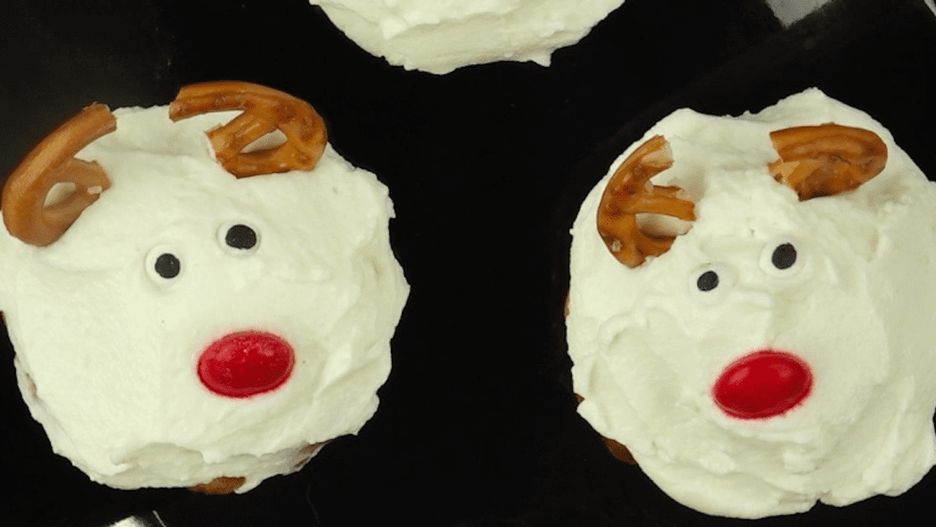 3. Do każdej babeczki wbij po dwóch kawałkach precli tak, aby przypominały rogi, po dwóch oczkach i po jednym M&M's, który posłuży jako nosek.