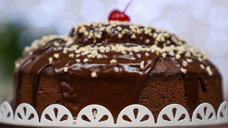 Nasz świąteczny wypiek ozdobiliśmy również przy pomocy posiekanych orzechów włoskich. Świetnie sprawdzą się tutaj również migdały, jak i orzechy pekan. Na koniec pyszny piernik ozdobiliśmy przy pomocy czereśni w syropie. Smacznego!