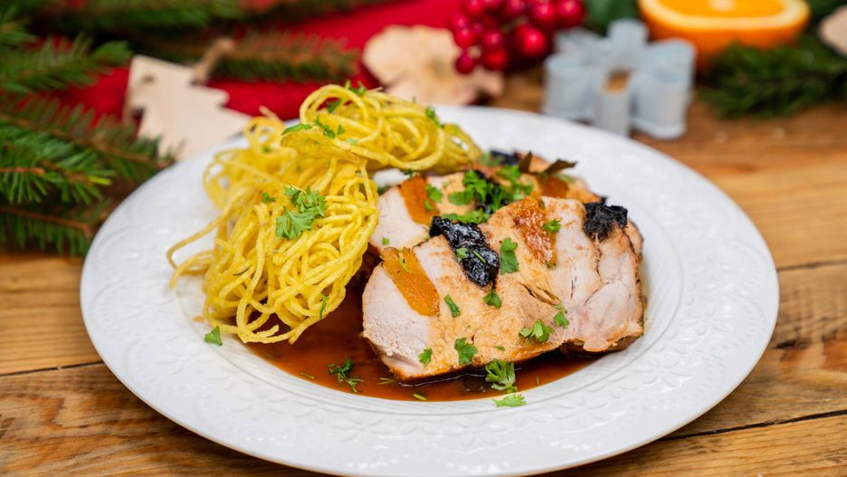 Genialny świąteczny schab wieprzowy połączyliśmy z suszonymi owocami, fenomenalnym sosem oraz ziemniaki w ciekawej formie. Taka kombinacja to gotowa receptura na świąteczny hit. W czasie pieczenia powstaje sos, który zwieńcza całe danie.
