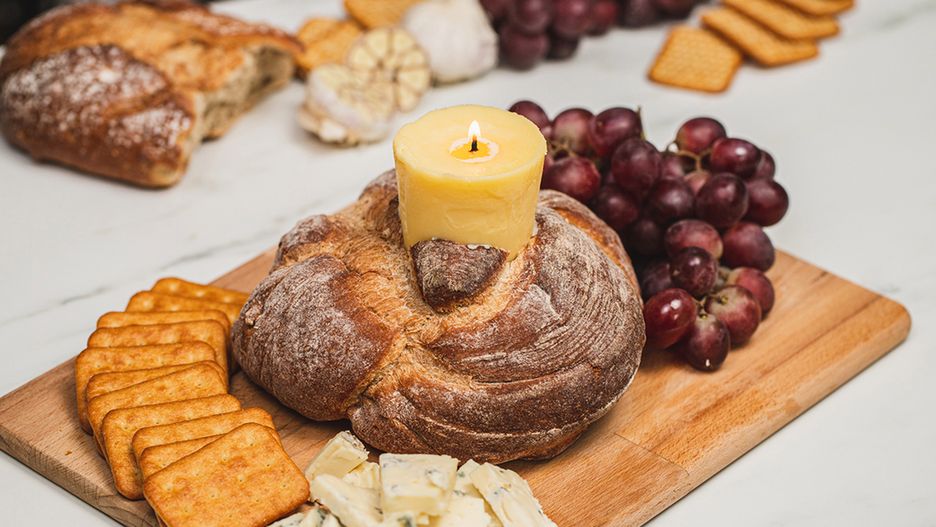 Kiedy masło już dobrze stężeje, wyjmij je z lodówki. Usuń plastikowy kubeczek i umieść świecę w wydrążonym nieco chlebie. Odpal "knot", a topiące się masło nabieraj na kromki świeżego pieczywa. Zaskakująca przystawka jest już gotowa.