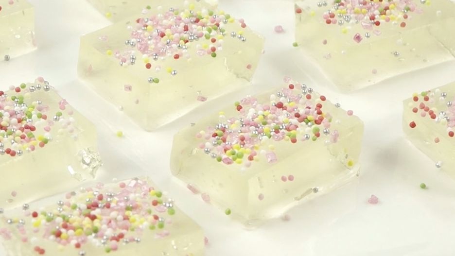 3. Po 2 godzinach wyjmij blaszkę z lodówki i pokrój zastygniętą galaretkę na kwadraciki. Posyp je z wierzchu kolorową posypką.