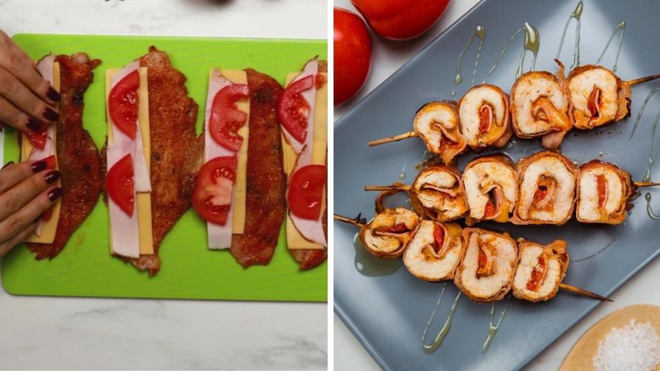 Zwiń każdy kawałek mięsa w rulonik, po czym obtocz plastrami boczku. Poszczególne elementy ułóż blisko siebie, aby stworzyły jedną całość. Powstałą konstrukcję zabezpiecz przy pomocy patyczków do szaszłyków.