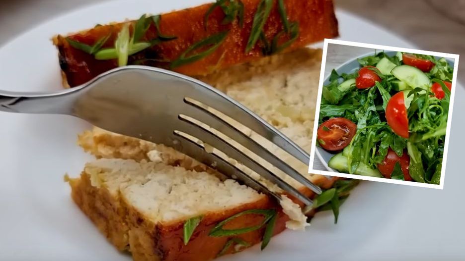 To dobry moment, by przygotować sałatkę z dressingiem. W misce umieść rukolę, dodaj pokrojonego w półplasterki ogórka, pomidorki koktajlowe pokrój w ćwiartki, a natkę pietruszki posiekaj. Wyciśnij sok z połowy cytryny. Wymieszaj w naczyniu oliwę z oliwek z łyżką miodu i musztardy, dodaj do sałatki i wszystko wymieszaj. Upieczone danie pokrój na centymetrowe plastry i podaj z przygotowaną sałatką. Szybki obiad jest już gotowy. Smacznego!