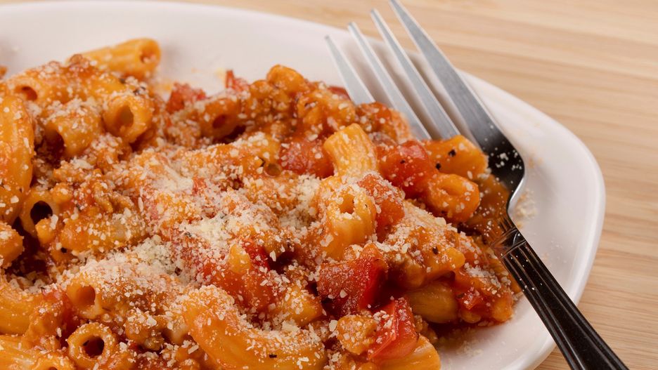 - Połącz makaron z sosem na patelni, mieszając, aby dobrze pokrył się pomidorowym sosem. W razie potrzeby dolej nieco wody z gotowania makaronu.