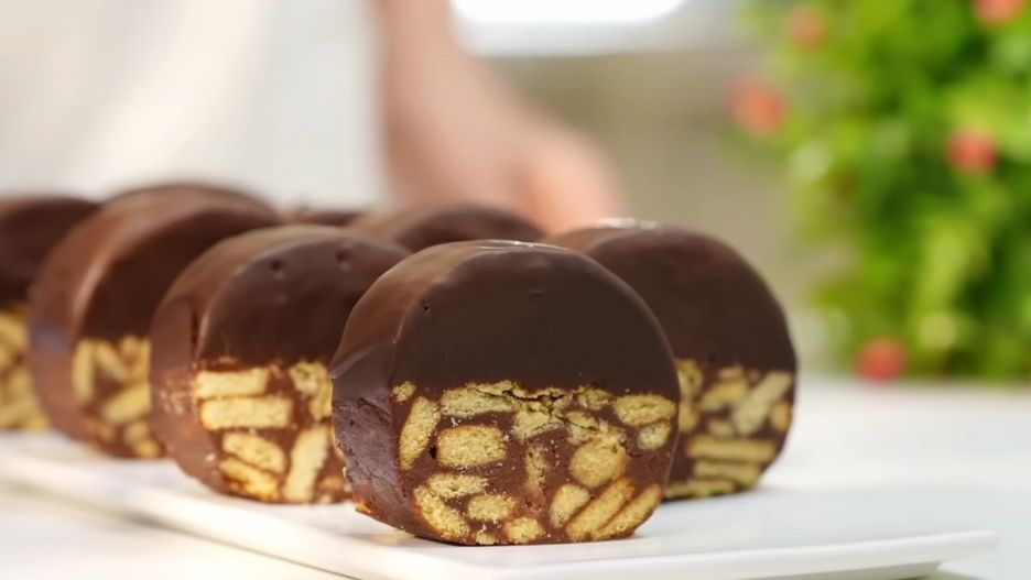 W tym czasie przygotuj glazurę. Czekoladę posiekaj nożem i rozpuść w garnuszku. Po wyjęciu ciasta z lodówki pokrój je w kawałki. Zamocz je do połowy w rozpuszczonej czekoladzie i pozwól jej ,,obciec". Wstaw z powrotem do lodówki do zastygnięcia polewy. Smacznego!