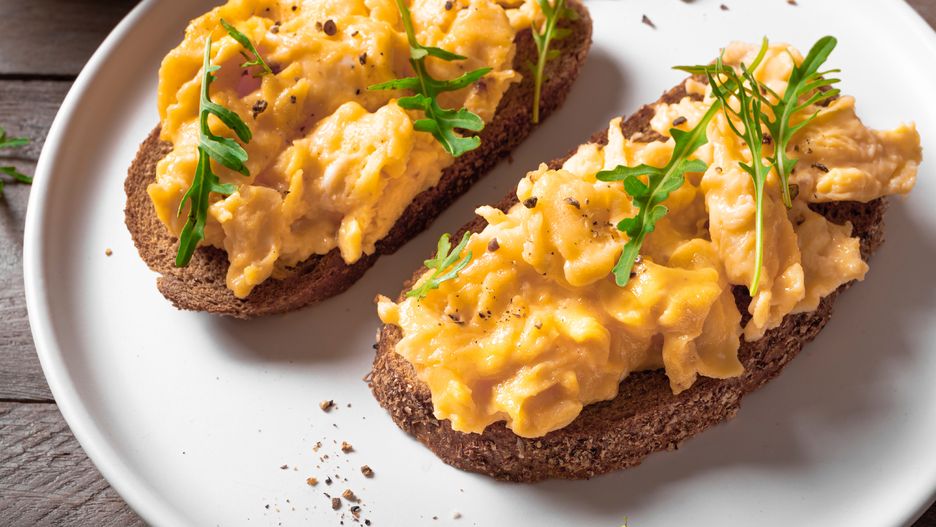 Następnie należy postawić średnią patelnię na małym ogniu i dodać masło, pozwalając mu powoli się roztopić. Gdy zacznie się pienić, wlej jajka i mieszaj drewnianą łyżką. Kontynuuj delikatne mieszanie, aż jajka będą wyglądały jedwabiście i lekko płynnie, a następnie zdejmij z ognia. Na ciepłej patelni jajka wciąż będą się jeszcze przez chwilę smażyć, aż do uzyskania pożądanej konsystencji. Jajecznicę podawaj na chrupiącym toście.