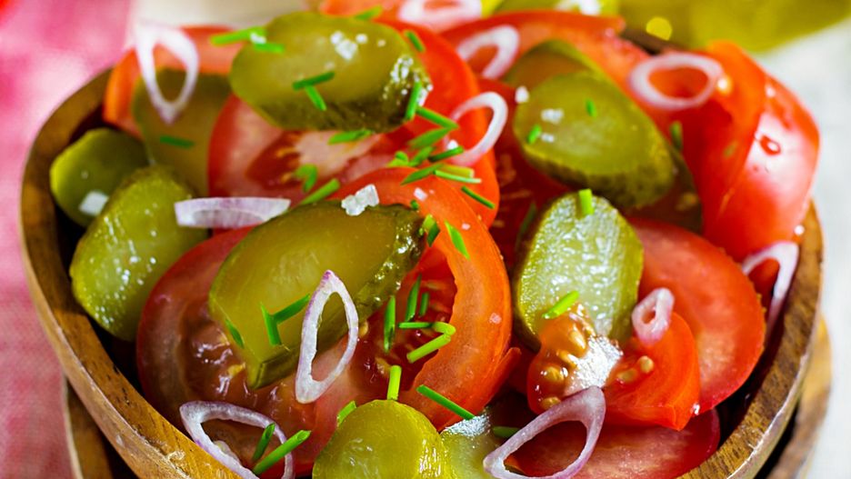 Moja surówka łączy w sobie kiszone ogórki ze świeżym pomidorem i papryką, a tym samym nie tylko dostarcza cennych witamin, ale również jest źródłem probiotyków, niezwykle ważnych dla zdrowia jelit.